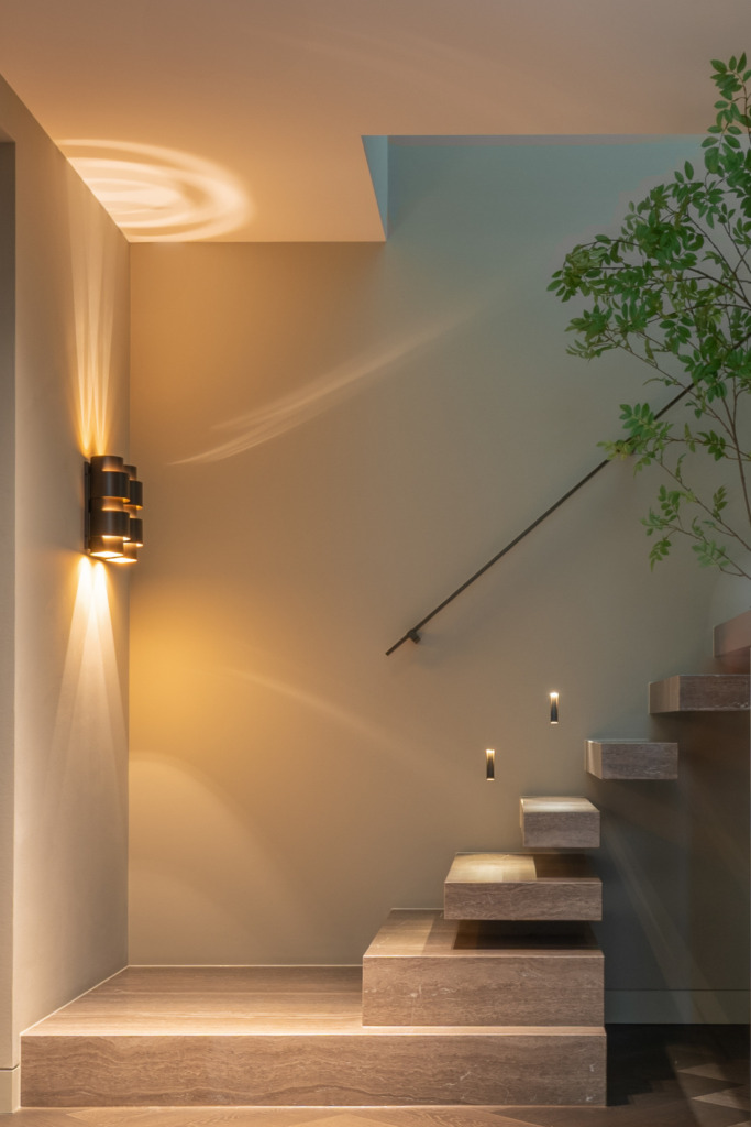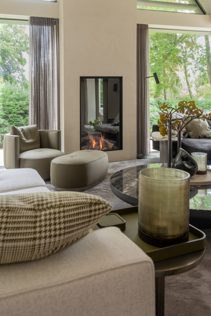 Binnen springt de natuurstenen trap direct in het oog, samen met de natuurstenen wandafwerking die zorgen voor een robuuste en luxe uitstraling. De ruimtes op de begane grond staan in open verbinding met elkaar en vormen samen een transparant geheel door het gebruik van stalen taatsdeuren en schuifdeuren. De living bestaat uit een royale woonkeuken en een sfeervolle woonkamer. De eyecatcher in het interieur is de op maat gemaakte vakkenkast, waarin aan de ene zijde een haard en aan de andere zijde een tv is geïntegreerd. Op deze manier worden de ruimtes op een subtiele manier van elkaar gescheiden.
