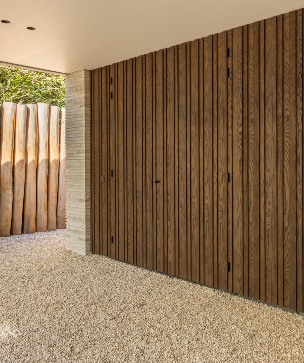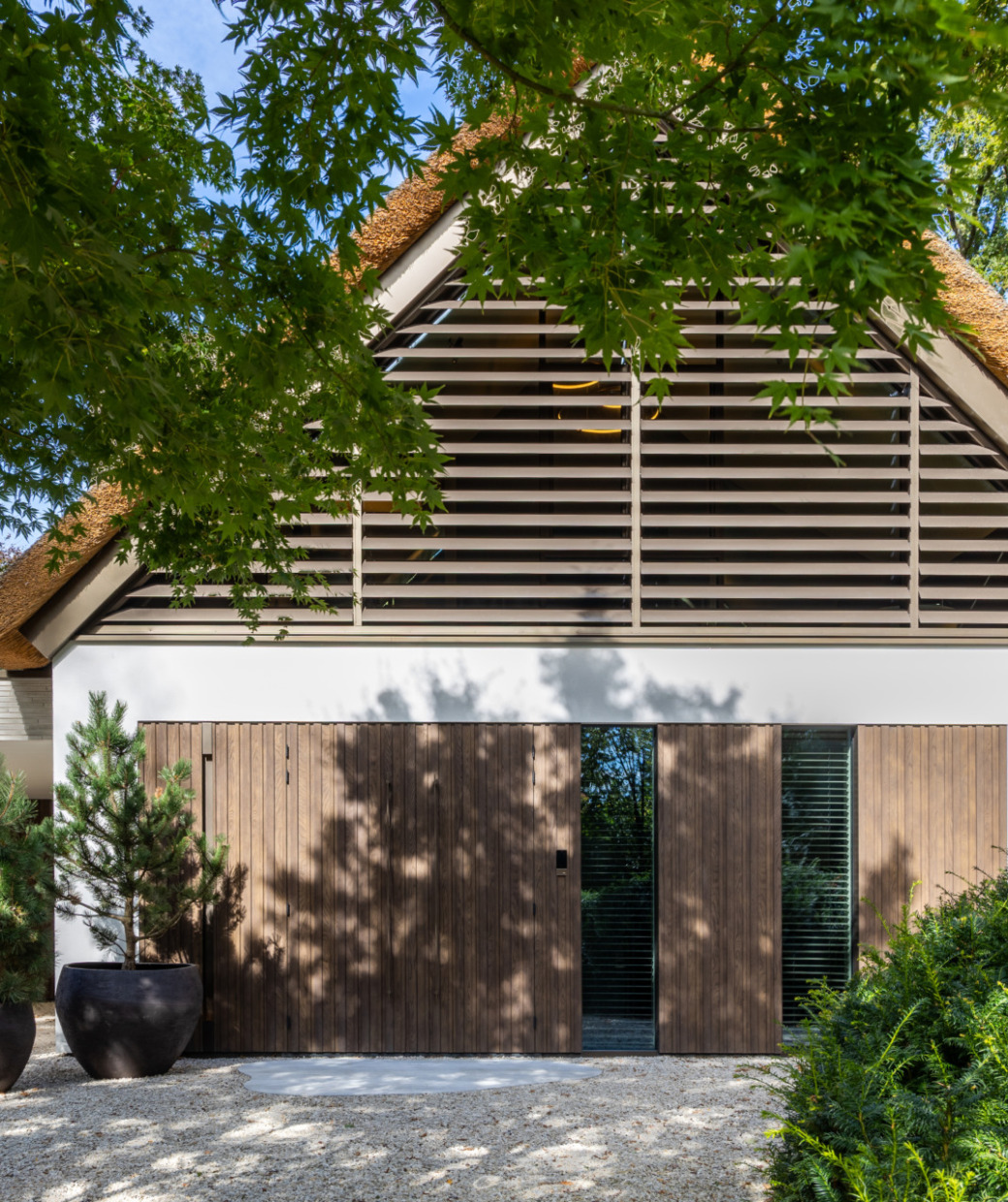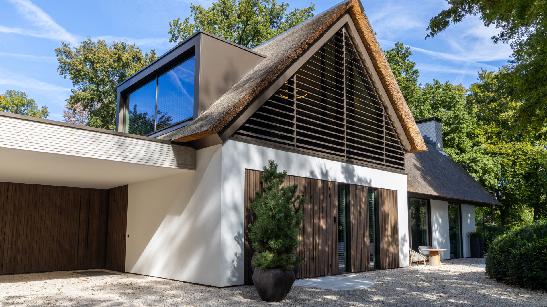 Bij aankomst op het perceel valt direct de strakke afwerking, de gestuukte buitenzijde en het stijlvolle rieten dak op. Wat een plaatje! De gevel is strak gestuukt en uitgevoerd met een fraaie Petersen gevelsteen gecombineerd met moderne gevelbekleding. De voordeur is hier volledig in verwerkt en de lijnen van het ontwerp worden benadrukt door subtiele verlichting. De lamellen zorgen voor de juiste balans tussen licht, privacy en comfort. Aluminium vorsten zijn de strakke dakranden bovenop het rieten dak. Deze zorgen niet alleen voor een modern accent, maar ook voor extra duurzaamheid. Opvallend is hoe de kleuren binnen en buiten de villa volledig op elkaar zijn afgestemd, wat zorgt voor stijlvolle totaalbeleving.