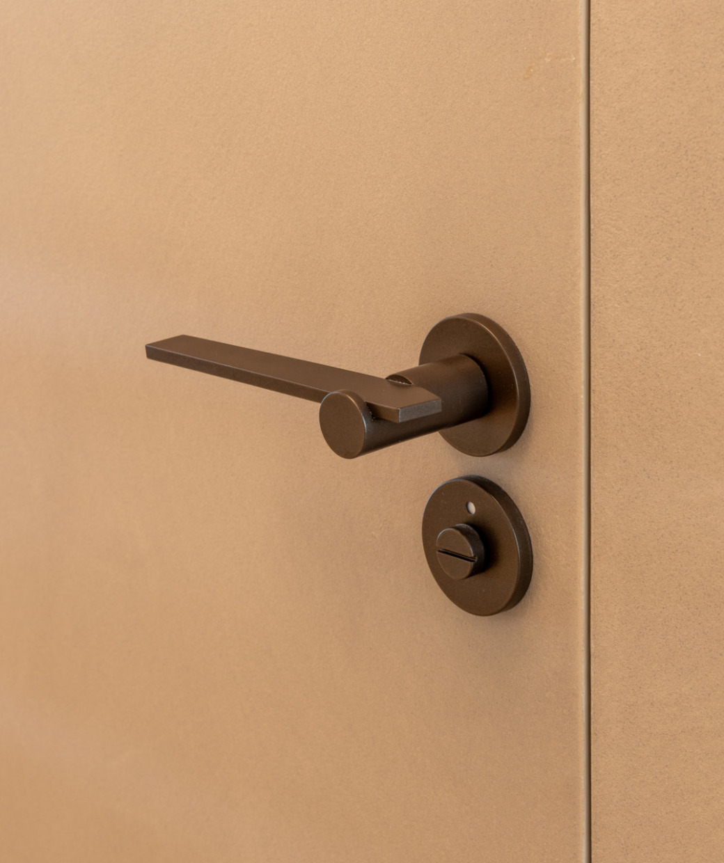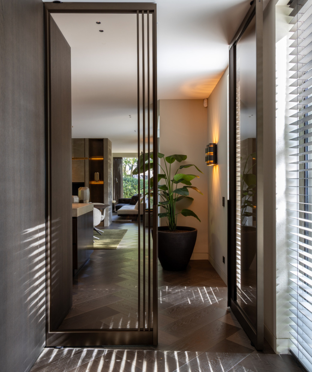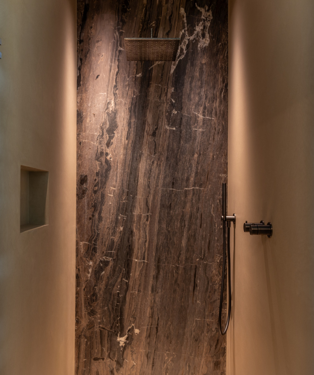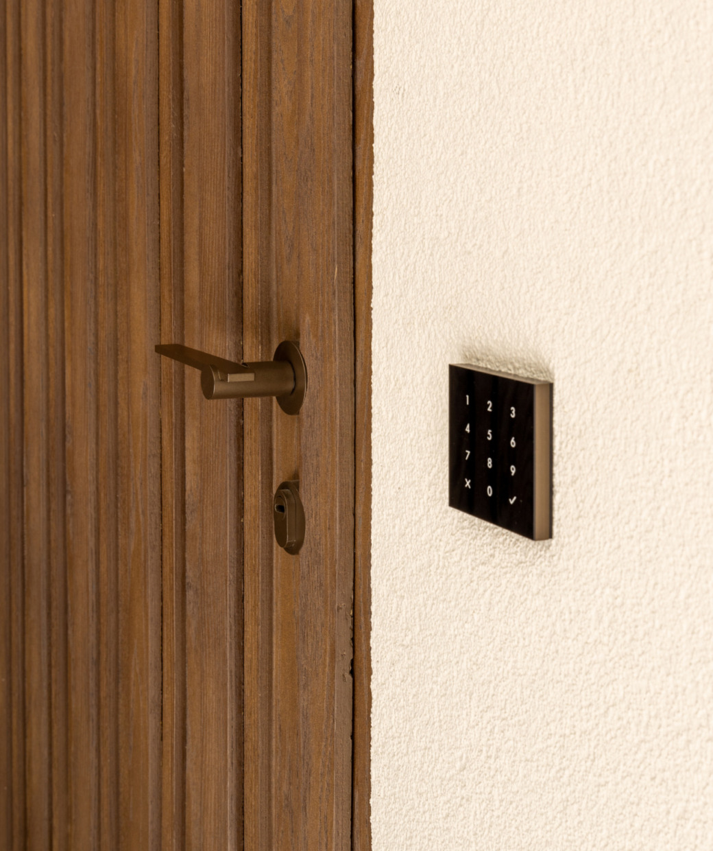 Bij aankomst op het perceel valt direct de strakke afwerking, de gestuukte buitenzijde en het stijlvolle rieten dak op. Wat een plaatje! De gevel is strak gestuukt en uitgevoerd met een fraaie Petersen gevelsteen gecombineerd met moderne gevelbekleding. De voordeur is hier volledig in verwerkt en de lijnen van het ontwerp worden benadrukt door subtiele verlichting. De lamellen zorgen voor de juiste balans tussen licht, privacy en comfort. Aluminium vorsten zijn de strakke dakranden bovenop het rieten dak. Deze zorgen niet alleen voor een modern accent, maar ook voor extra duurzaamheid. Opvallend is hoe de kleuren binnen en buiten de villa volledig op elkaar zijn afgestemd, wat zorgt voor stijlvolle totaalbeleving.