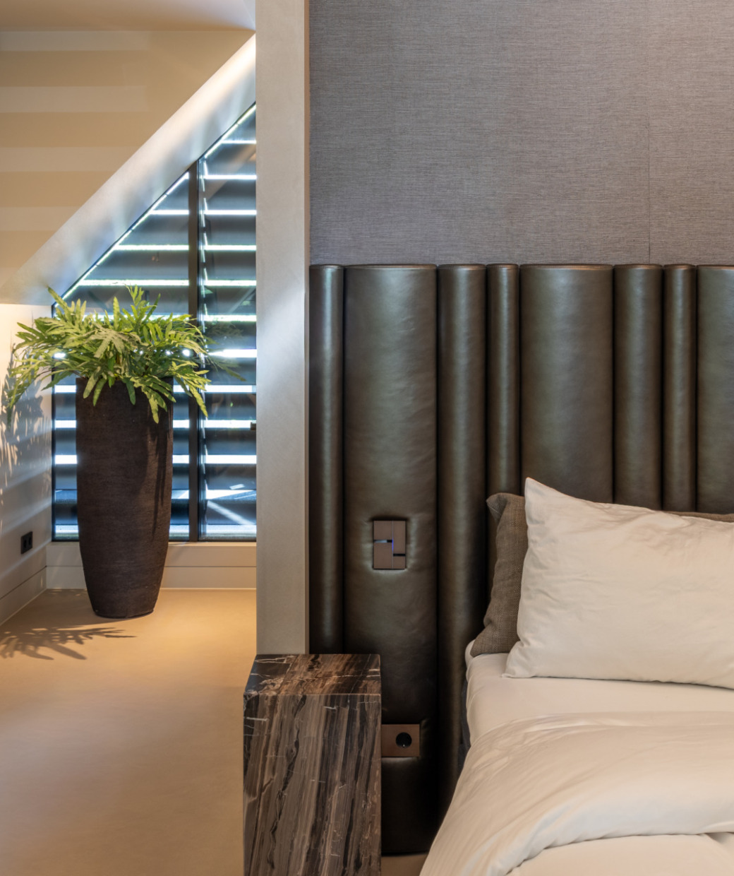 De woning is levensloopbestendig ontworpen met alle woonfuncties op de begane grond. De master bedroom vormt een harmonieus geheel met de aangrenzende kleedkamer, waar maatwerk inbouwkasten zorgen voor zowel functionaliteit als luxe uitstraling. Direct hiernaast is een moderne badkamer gerealiseerd, stijlvol vormgegeven en voorzien van hoogwaardige materialen.